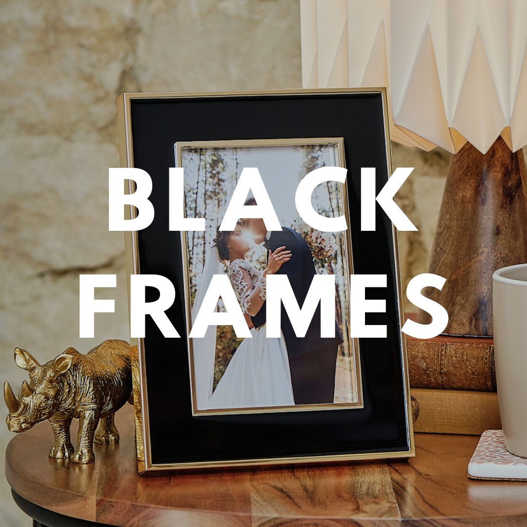 Frisco Plastic Photo and Poster Frames in Black shown in home with yellow sofa Frisco Plastic square photo frames in Black show with records in