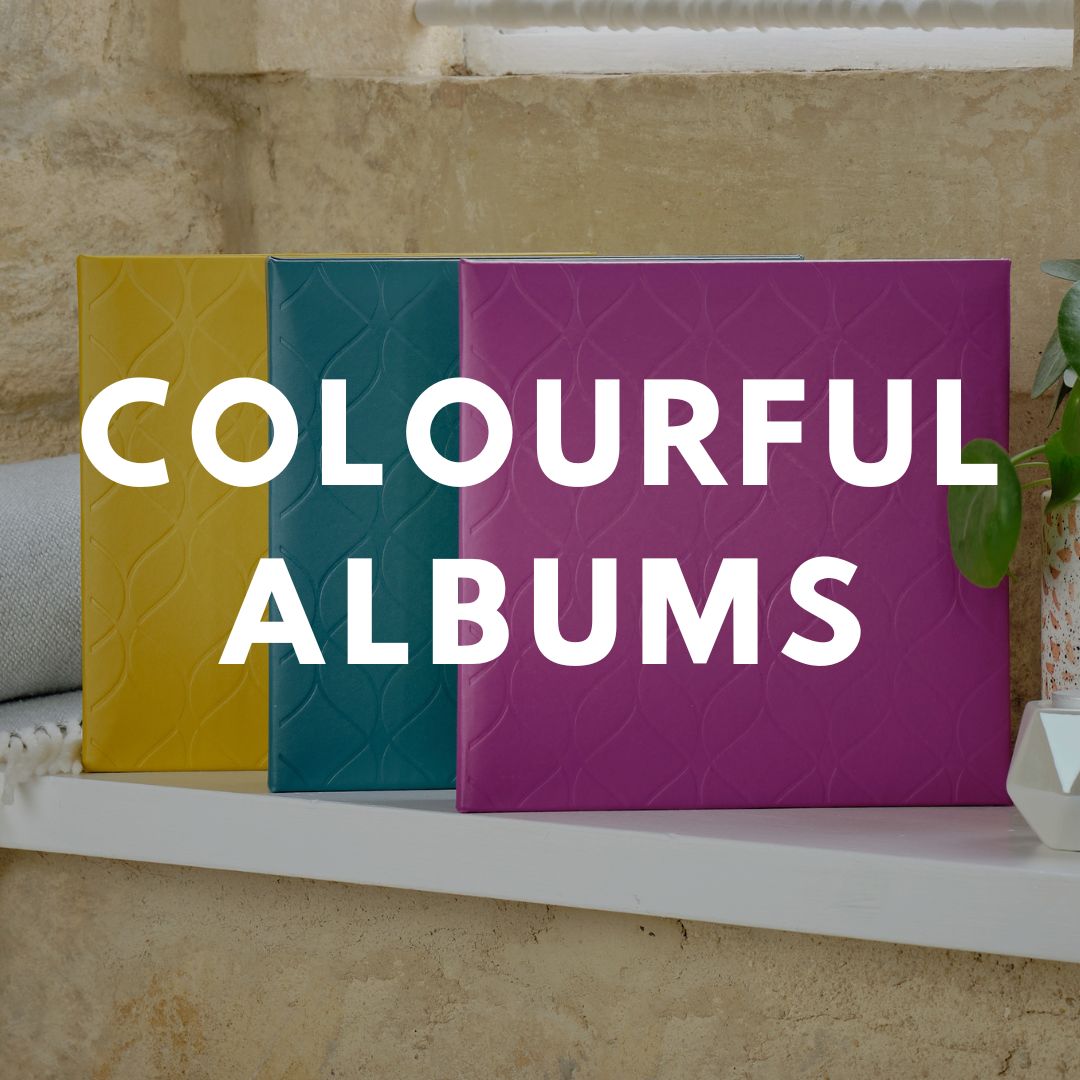 A colorful polka dot photo album with a teal green spine is displayed next to an open album showing printed photos, alongside scattered candies and a pair of scissors. Candy Spots Series Photo Albums