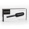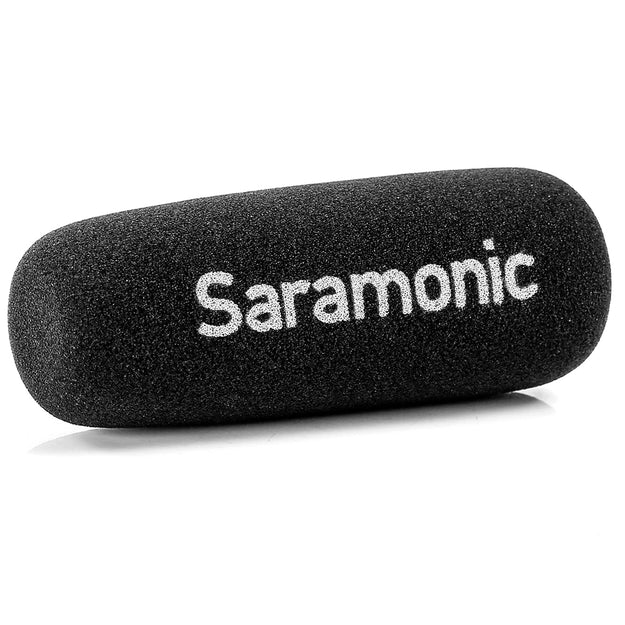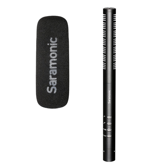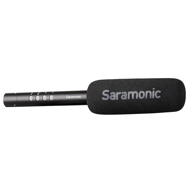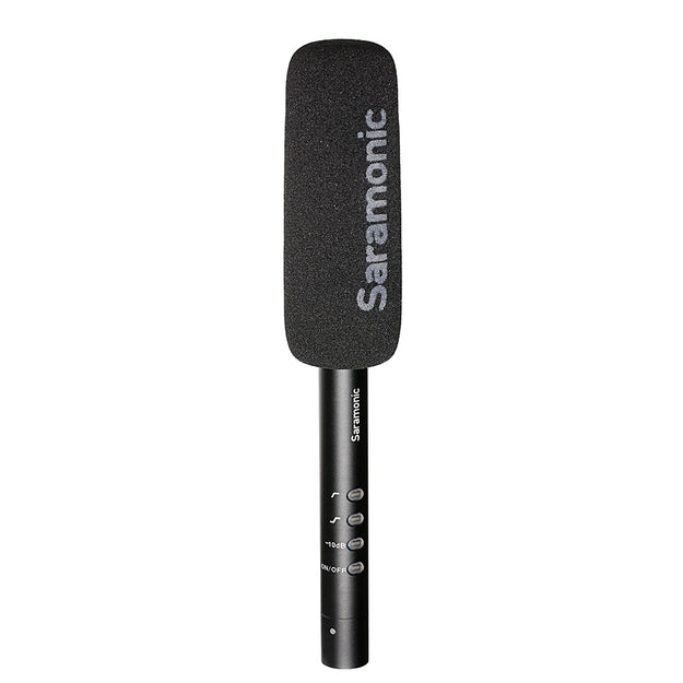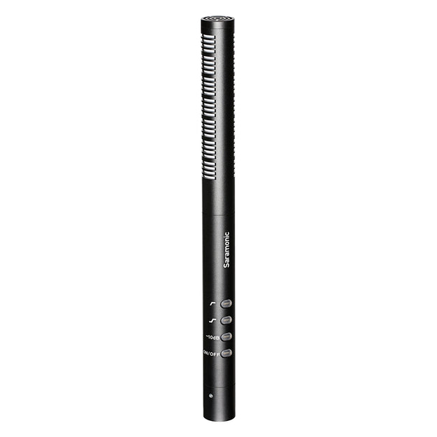 The Saramonic SRTM1 is a directional shotgun-style microphone featuring a cardioid polar pattern. It has a built-in rechargeable battery, 150 Hz low cut switch, + 6 dB high frequency boost, -10 dB pad, and power button.