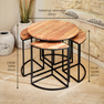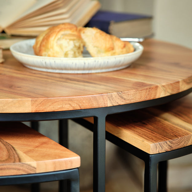 This larger set of acacia wood nesting tables offers five tables in one, with a large central coffee table (63cm diameter, 54cm high) to serve as the centrepiece, and four smaller quadrants that safely and conveniently tuck away underneath, offering a versatile and space-saving solution to complement your living space without compromising on floor space. Crafted with care, these nesting tables have tops of solid authentic Indian acacia wood, firmly fixed to chic, durable and minimalist black iron frames.