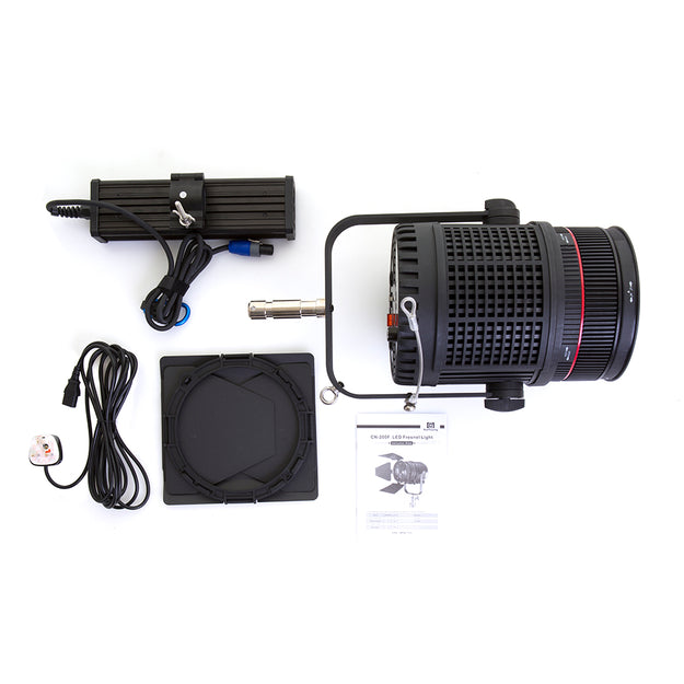 The full kit comprises: CN200F head, barn doors, Fresnel lens, power adapter, fitted box.
